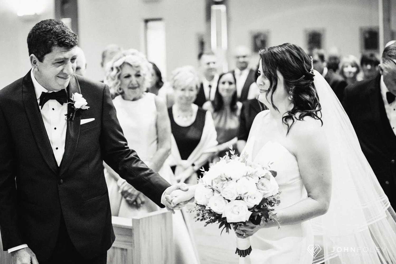 The day began at The Drake in Oakbrook where both Meghan and Johnny were getting ready. Meghan and her bridesmaids were in the Nagle Room while the guys were in the Sinatra Room. Both groups were calm and having a good time. After Meghan stepped into her elegant wedding gown, she had a First Look with her father. It was such a special moment to capture. We then headed to Notre Dame Church in Clarendon Hills.